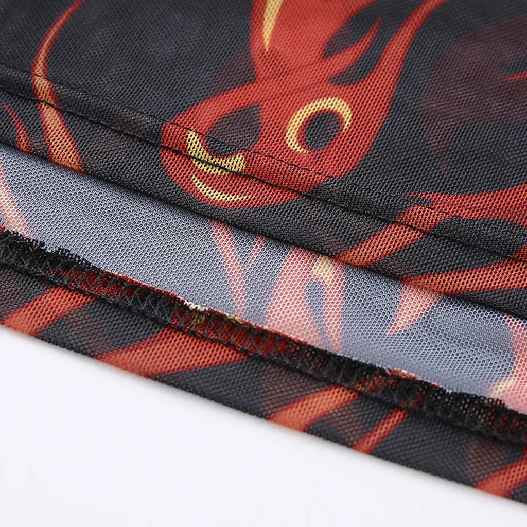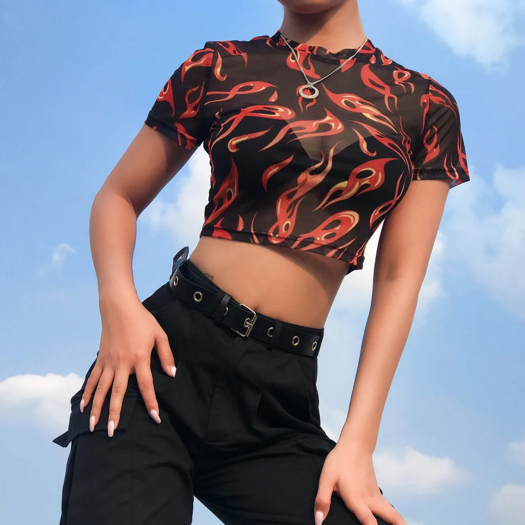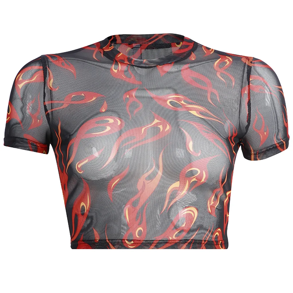 Модный женский сексуальный топ с круглым вырезом и коротким рукавом с принтом пламени