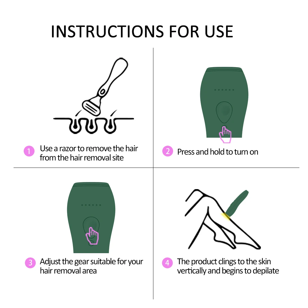 5 уровней энергии: этот постоянный прибор для удаления волос унисекс имеет 5 уровней энергии, прост в использовании. Просто нажмите кнопку ВКЛ/ВЫКЛ и настройте уровень, который вам подходит, а затем используйте его. Гуманный руль делает инструмент более удобным в использовании. Два режима: устройство для удаления волос IPL имеет автоматический режим и ручной режим. Автоматический режим: удерживайте кнопку спуска, чтобы непрерывно мигать, подходит для линии бикини, лица и подмышек. Ручной режим: Нажмите один раз, вспышка один раз, подходит для спины, рук и ног. Будьте внимательны: с вилкой, продукт не может быть перезаряжен. Пожалуйста, следуйте инструкциям для бритья волос. Рекомендуется стартовать с первого уровня и постепенно увеличиваться в соответствии с адаптируемостью induvidual кожи. Не подходит для бровей. Наши продукты проходят строгую проверку и полностью соответствуют различным экспортным стандартам. Пожалуйста, будьте уверены, чтобы купить! Технология IPL: постоянное и профессиональное оборудование для удаления волос IPL использует передовую технологию IPL, чтобы сломать цикл регенерации волос. Каждый может побрить волосы дома. 100% безопасность: продукт на 100% безопасен для использования в течение всего срока службы, поэтому вам не нужно беспокоиться о безопасности. Следуйте инструкциям, чтобы правильно использовать Инструмент IPL, чтобы помочь вам быстрее удалить волосы на теле.
