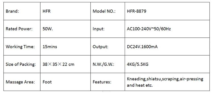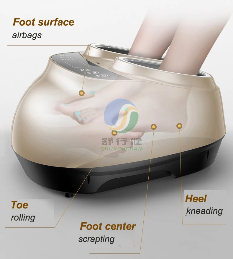 1. Разработан с ABS класса люкс-образная внешний вид и 6 Кнопки для печати по всему телу для того чтобы контролировать функции массажа; 2. Разработан с кожей выскабливание шиацу массажных головок с подогревом на подошве центр позиции; 3. Разработан с Роллинг массаж головы на носочной части позиции; 4. Дизайн с разминающий массаж головы с открытой пяткой, позиция; 5. Дизайн с воздушная подушка массажа на подъеме позиции; 6. Конструкция с моющейся тканью крышка; 7. Есть 3 режима, 3 уровня интенсивности и Функция синхронизации; 8. Предназначен с помощью беспроводного пульта дистанционного управления и ручной сенсорные кнопки.