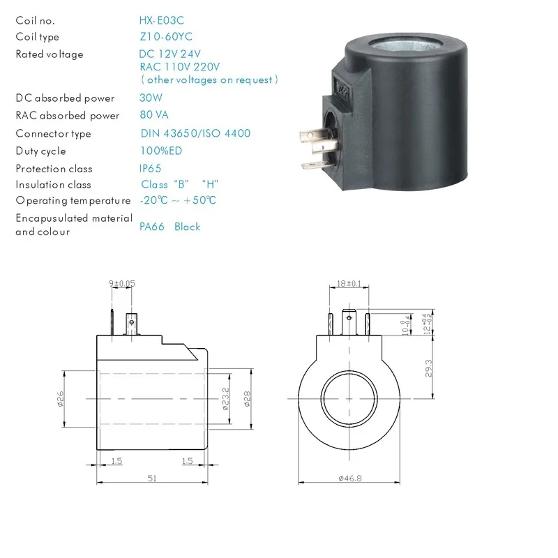 Hydraulic Directional Valves Solenoid Coil constructive Characteristics 1. Magnetic circuit encapsulated with fibre-glass reinforced nylon 2. Standard colour PA66 black 3. Metallic parts protected against oxidation 4. DC12V 24V RAC110V 220V for options 5. Connetor type: DIN43650 / ISO4400 6. IP65 Protection and B H insulation class 7. 100%ED DUTY Cycle 8. Working Temp: -20~50 degree 9. Suction Force 60N