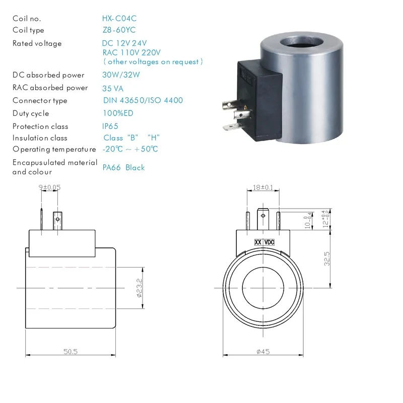 Гидравлические направленные клапаны соленоидная катушка конструктивные характеристики 1. Магнитная цепь, капсулированная DMC 2. Стандартный цвет DMC белый 3. Металлические детали, защищенные от окисления 4. Dc 24V RAC110V 220V для опций 5. Тип соединителя: DIN43650 / ISO4400 6. Защита IP65 и класс изоляции H/B 7. Рабочий цикл 100% ED 8. Рабочая температура: -20 ~ 50 градусов 9. Сила всасывания 60N
