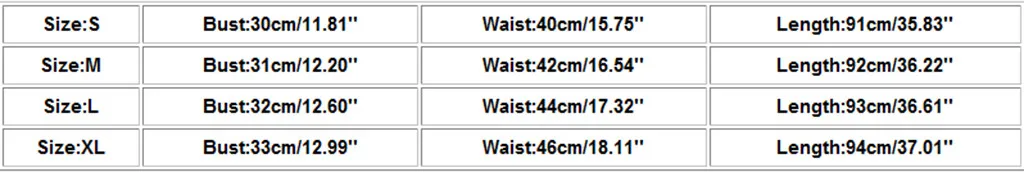 Размер Бедра Талия Длина S 80 см/31,50'' 60 см/23,62'' 92 см/36,22'' М 84 см/33,07'' 64 см/25,20'' 94 см/37,01'' L 88 см/34,65'' 68 см/26,77'' 96 см/37,80'' XL 92 см/36,22'' 72 см/28,35'' 98 см/38,58''