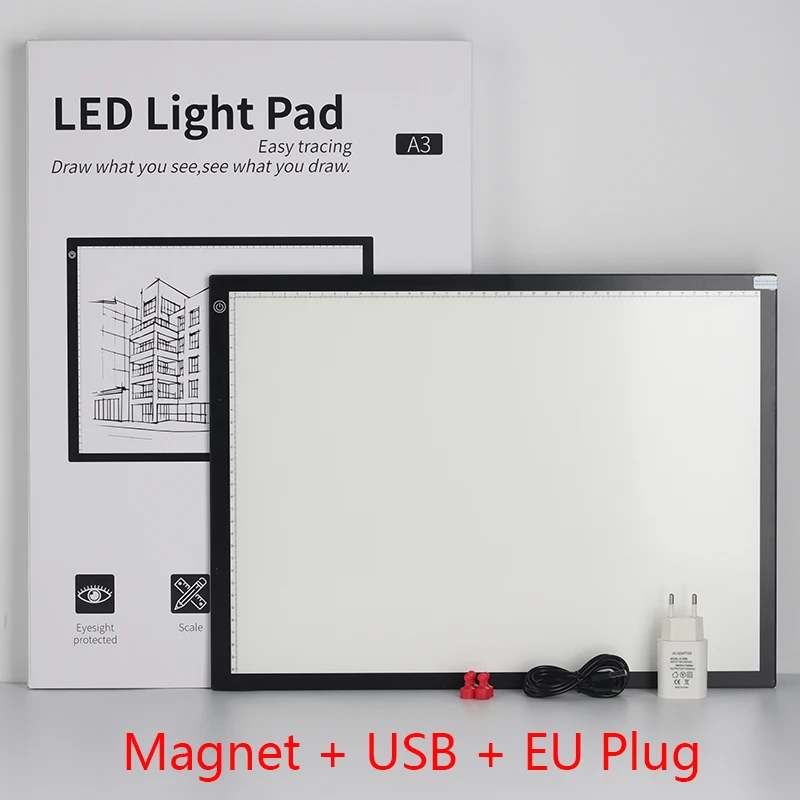 Материал: акрил Размер: 46 см * 33,7 см * 0,55 см Тип: A3 Рабочее напряжение: 5 В 2 А Номинальная мощность: 8,6 Вт Яркость: плавное затемнение, трехуровневое затемнение