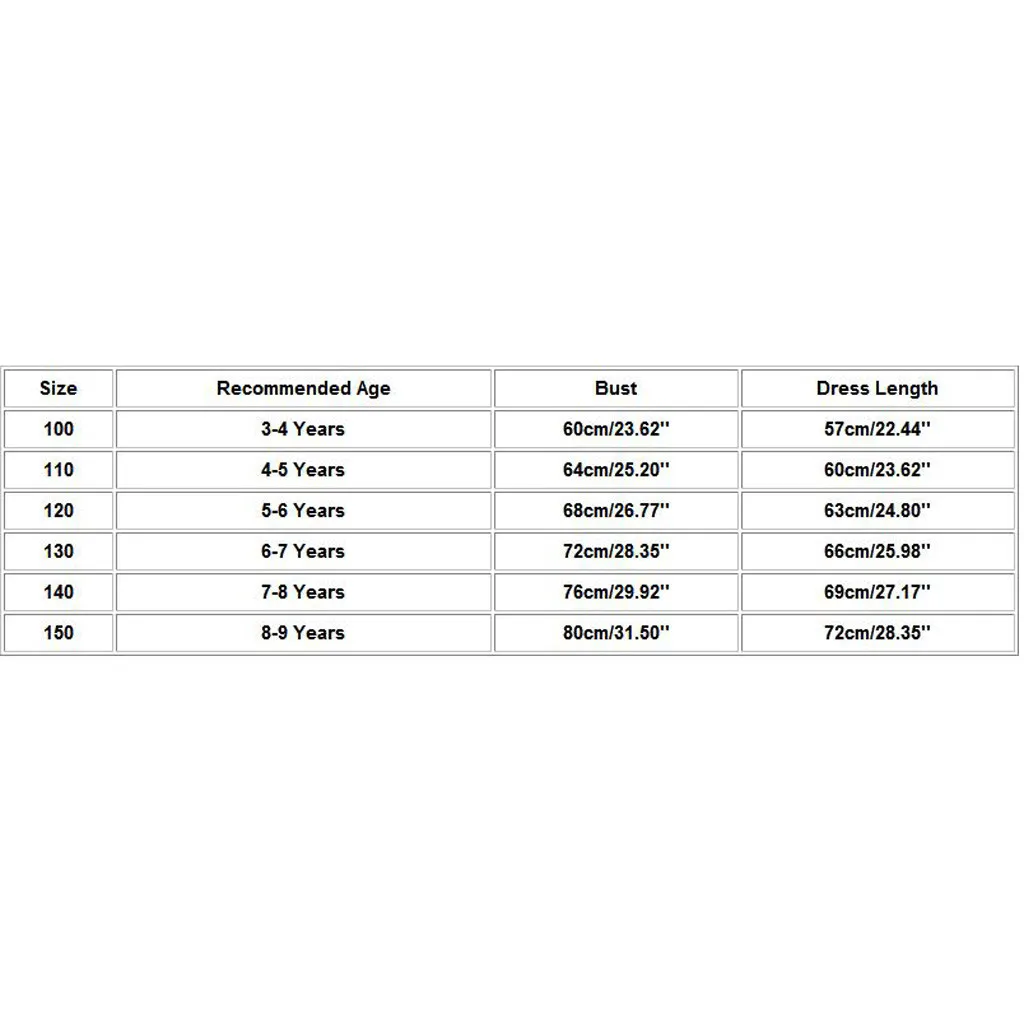 Размер Рекомендуемый возраст Бюст Длина платья 100 От 3 до 4 лет 60 см/23,62'' 57 см/22,44'' 110 От 4 до 5 лет 64 см/25,20'' 60 см/23,62'' 120 От 5 до 6 лет 68 см/26,77'' 63 см/24,80'' 130 От 6 до 7 лет 72 см/28,35'' 66 см/25,98'' 140 От 7 до 8 лет 76 см/29,92'' 69 см/27,17'' 150 От 8 до 9 лет 80 см/31,50'' 72 см/28,35''