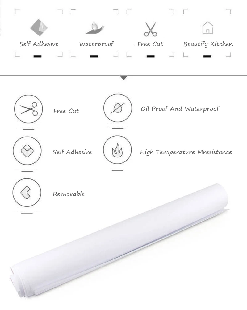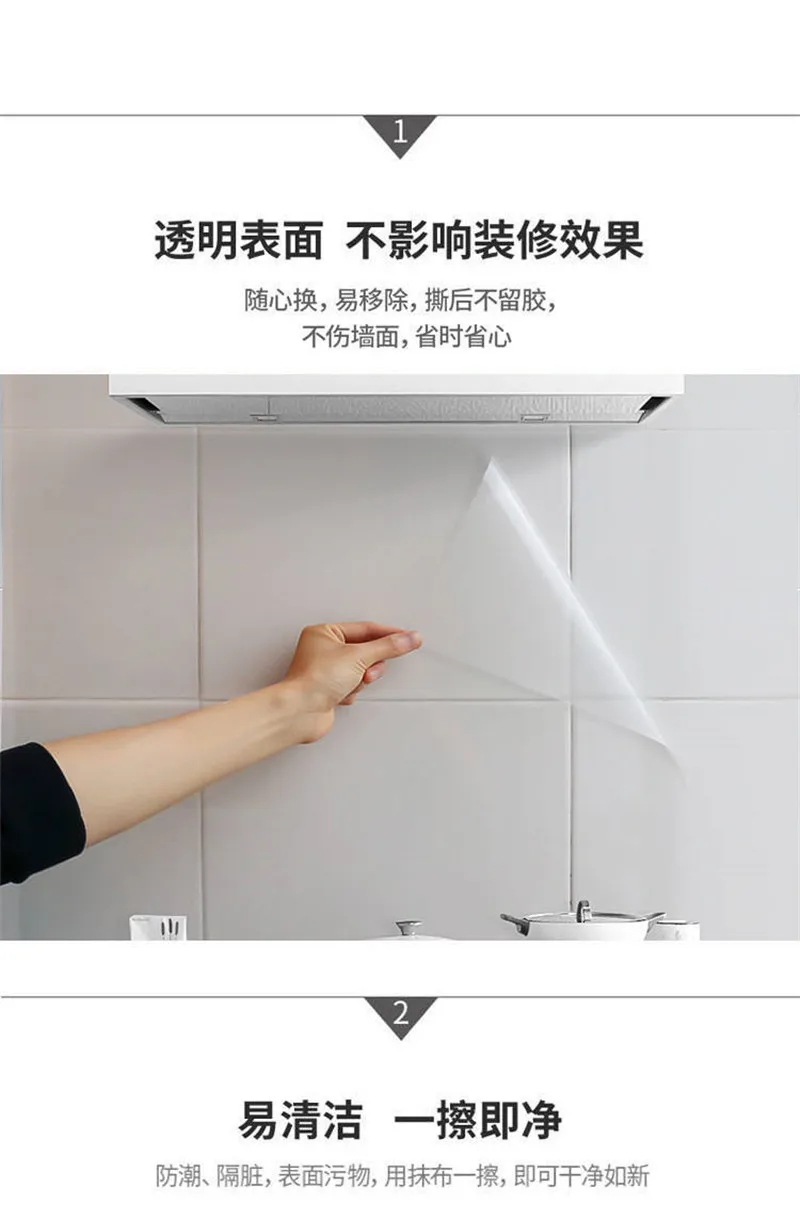 Material: PET Size: 60x90cm/60x300cm Feature: Oil proof, Waterproof, Antifouling, High Temperature Resistance, Free cut, Self adhesive, Removable, Transparent. Application Space: Kitchen wall, Cooktop, Range hood surface, Microwave surface, Refrigerator surface, Cupboard, Dining table etc.