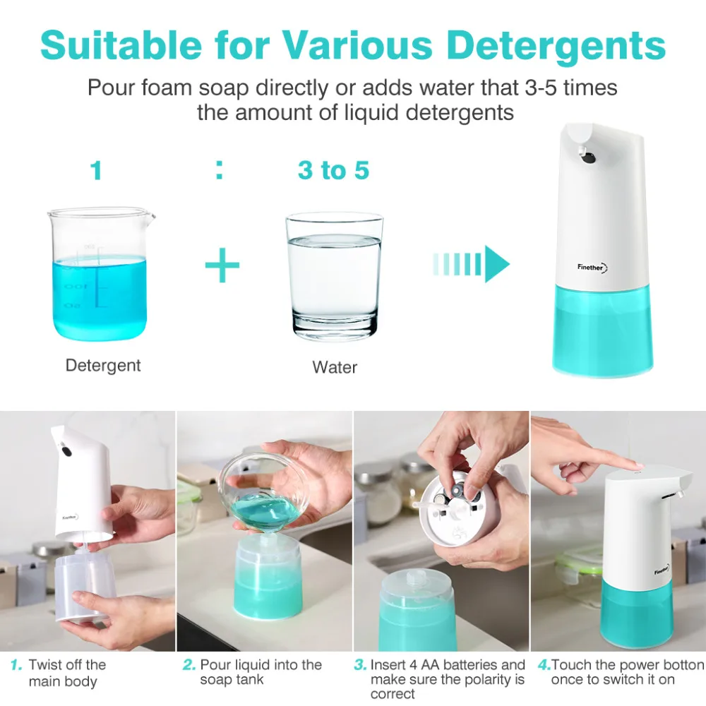 Хорошо работает с любым мылом: Просто налейте обычное жидкое мыло в резервуар для мыла непосредственно для использования или Смешайте каждый объем моющих средств с 3-5 единицами объема воды; прозрачный резервуар объемом 350 мл позволяет вам видеть содержимое, чтобы вы знали, когда нужно пополнять