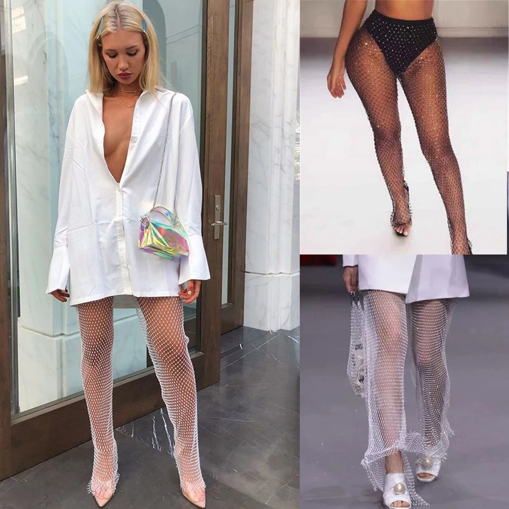 Блестящие женские штаны со стразами, сексуальные эластичные длинные штаны в сетку, прозрачные