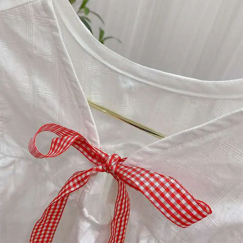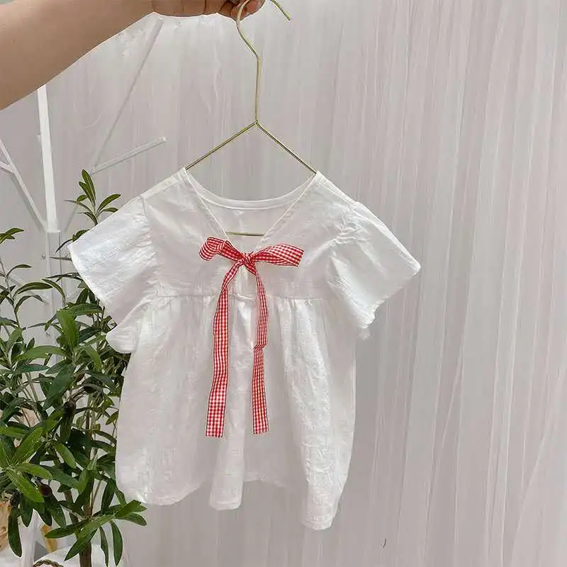 Детская одежда в Корейском стиле; Модель 2020 года; Сезон лето; Корейская версия хлопковой рубашки с рукавами-крылышками и бантом для маленьких девочек; Свободная кукольная рубашка