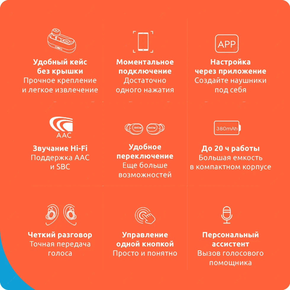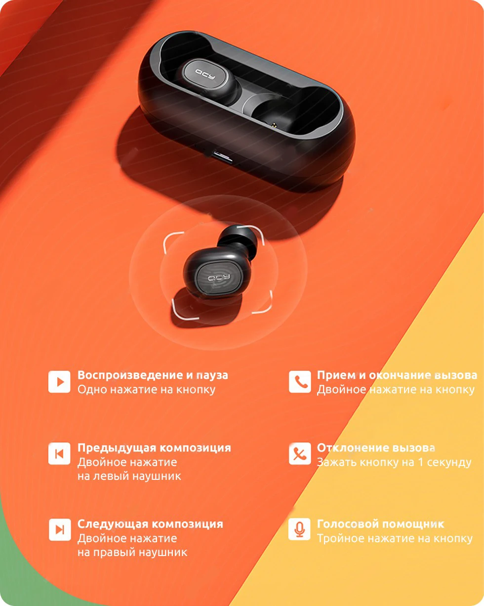 Простые и понятные жестыМузыка, вызовы, навигатор - всем этим и не только на наушниках QCY T1C можно управлять с помощью простых нажатий! Просто наденьте и попробуйте их функции во время занятий спортом или за рулем, чтобы освободить руки и не отвлекаться по мелочам.