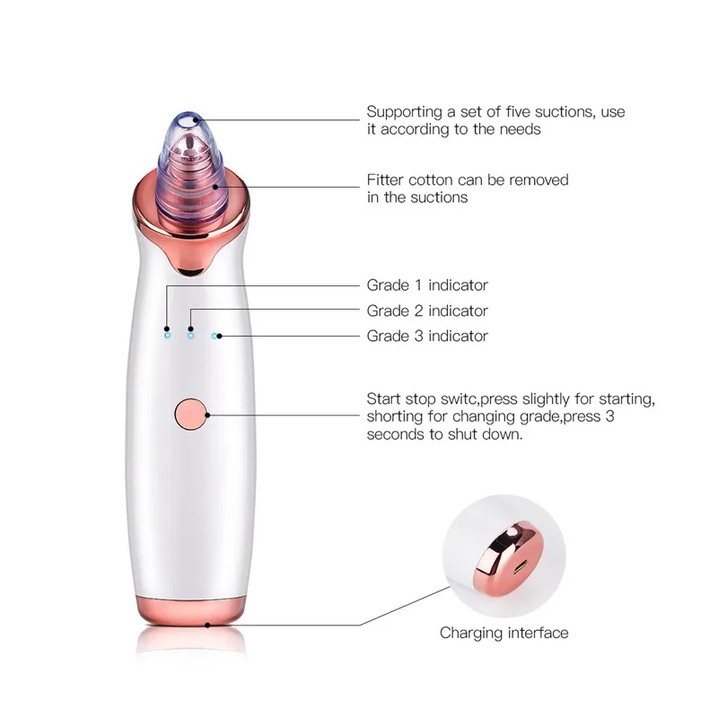 Упаковано с 4 различными зондами для решения всех ваших потребностей, удаления черных точек, жира, косметических остатков, прыщей, морщин из разных частей вашего лица, улучшения жизненной силы кожи, помогает разогнать поры и делает вашу кожу гладкой и подтянутой.