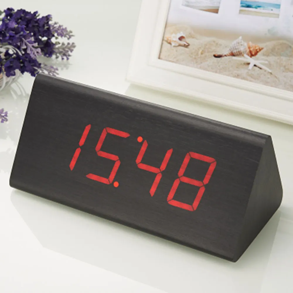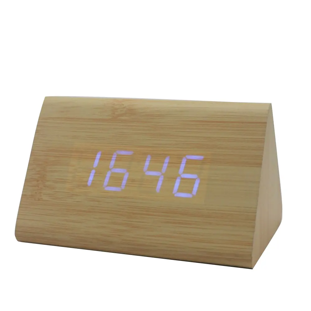 Colour: Brown / Wood color / Black Size: 120*80*70mm Weight: 250g Product List: 1 * Wood Clock, 1 * USB cableï¼x1 * User manual Item Description: Add a touch of modern to your bedroom, living room or office. This alarm clock displays time, date, temp and act also has an alarm. It can be plugged in via USB(included) or backed up by 4 AAA batteries (not included). The LED light shines through the wooden finish for a clean yet modern look. No buttons or plastic parts on the front and side of the clock as it's designed for simplicity. Matches perfectly with any modern designed office or home furniture. Feature: Updated 2016 version for brighter display.Tells time, date, temp and also has an alarm clock function via LED Light. DESIGN - Modern simplicity design with no buttons or plastic parts located on the front and four sides of the clock. LED light glows through the wooden finish for a clean modern look. Matches perfectly with any modern designed office or home furniture. SIZE: Clock measures 4.5 x 3 x 3 inches. Please note that this product has a voice control function, allowing the clock to go into standby mode after idled for 10 seconds. To activate or deactive this feature, simply press the "Down" button to toggle On or Off, which are indicated as "ON:Sd" and "-:Sd"