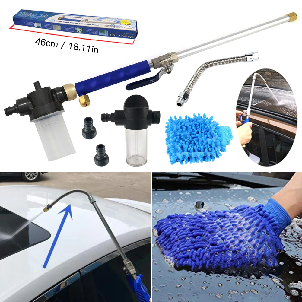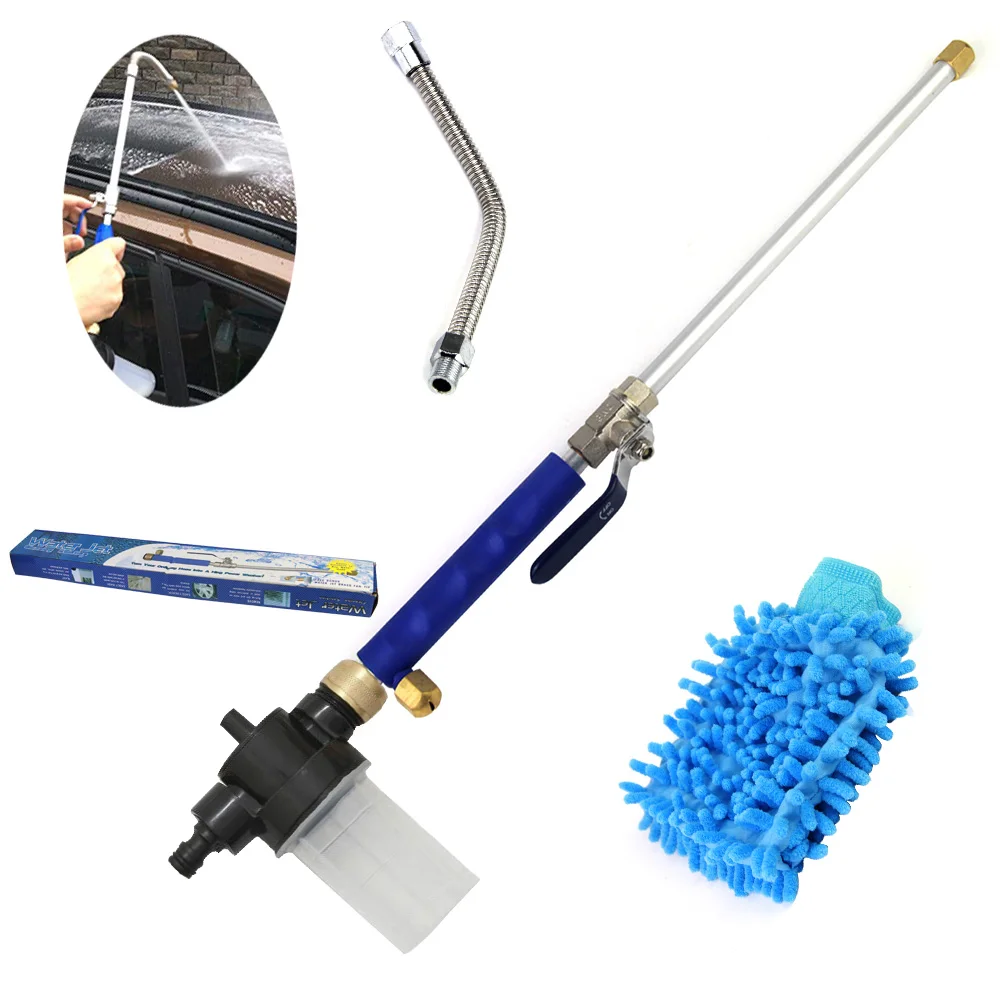 2. Эта гидро-струйная палочка для мойки давления имеет два наконечника: одна струйная струя, другая-действие вентилятора, и есть Гибкая палочка. Вода поступает из садового шланга с нормальным давлением, и с струйным соплом поток воды становится маленьким, но мощным, поэтому поток воды становится быстрым и струйным потоком. Это обычный распылитель для омывателя. (Примечание: без электричества и мощности, давление зависит от давления воды, без дополнительного давления.)