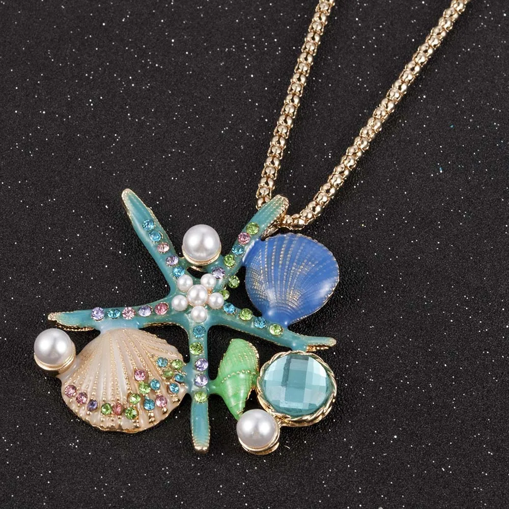 Accessories White Pearl Blue Enamel Crystal Shell Conch Starfish Pendant Long Necklace for Women