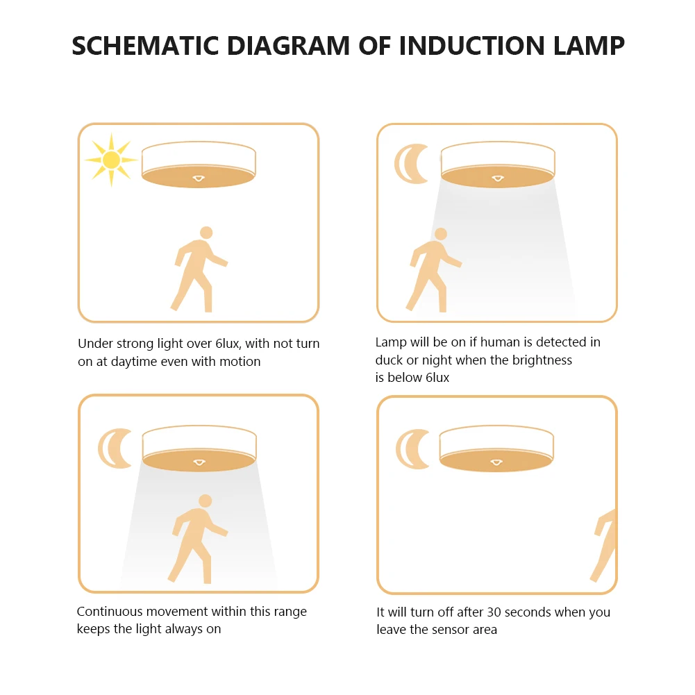 3. Потолочный светильник с датчиком движения работает только в темное или ночное время с освещением ниже 5 ~ 10 люмен.