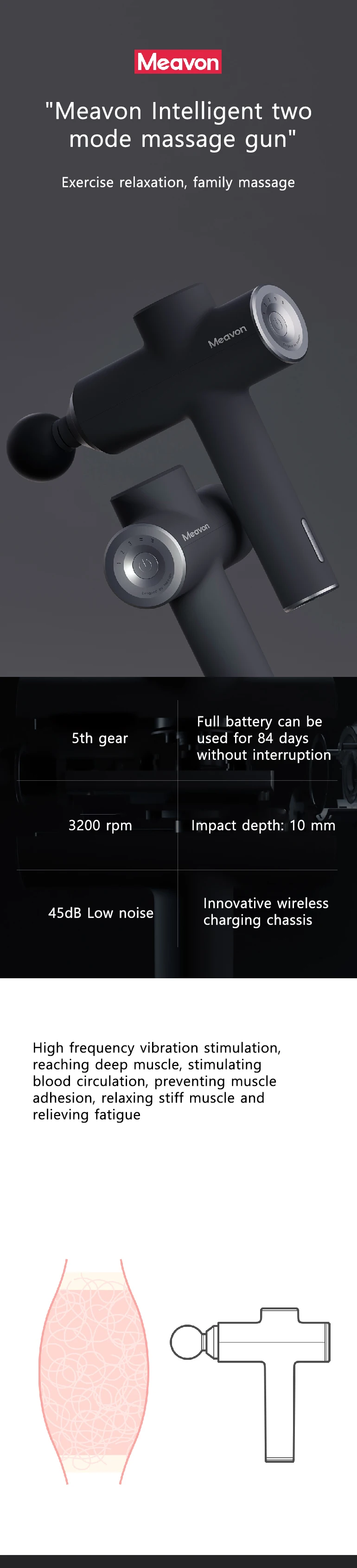 2020 Новый Xiaomi mi Meavon 3200r/мин массажер для тела электрический умный двойной режим Fascia Gun силиконовая головка глубокий массаж для домашнего тренажерного зала Обратите внимание: Является брендом компании Xiaomi Ecological Chain, на нем нет логотипа Xiaomi или логотипа Mi, спасибо за понимание. Параметры продукта Название продукта: Meavon Интеллектуальный двухрежимный модный пистолет Вес продукта: 0,8 кг Интенсивность: 5 двойных интеллектуальных режимов Рабочая среда: 0 ~ 40 ℃ Источник питания: перезаряжаемая литиевая батарея Исполнительный стандарт: GB4706 Общая проблема -Что такое пистолет фасции? Какое применение? Прежде чем разобраться с пистолетом фасции, вам нужно знать, что такое «фассия». Фасция похожа на большую сетку, которая обертывает опорно-двигательный аппарат и внутренние органы. Физические упражнения или Плохая осанка могут привести к поломке и повреждению, что приведет к адгезивным суставам, что приведет к мышечной боли и слабости, что вызовет человеческий дискомфорт. С Meavon, каждый пистолет фасции может быть стимулирован сильными и высокочастотными вибрациями, достигая глубоко в мышцах, стимулируя кровообращение, расчесывая мышечные спайки, расслабляя жесткие и плотные группы мышц, И удаляет боль и усталость, вызванные упражнениями. Для восстановления тела. -Каков Интеллектуальный двойной режим преобразования частоты? Пушки Meavon основаны на поддержании интенсивности массажа ядра 1800-3200 об/мин, И инновационно добавьте два режима преобразования частоты «успокаивающий и расслабляющий» и «глубокий массаж», чтобы имитировать традиционные методы массажа, сильные и слабые. Углубляйте шаг за шагом, постепенно и постепенно расслабляйте больные мышцы, легко адаптируясь к потребностям разных людей, чтобы вы могли наслаждаться профессиональным массажем дома. -Сколько времени можно заряжать один раз? Meavon выпускает высокопроизводительный литиевый аккумулятор емкостью до 2900 мА · ч в каждой фасции. Он может использоваться в течение примерно 14 часов в день 1 режим, рассчитывается в соответствии с ежедневным массажем в течение 10 минут, и может использоваться в течение примерно 2,5 месяцев при полной мощности. Беспроводная Зарядная база удобна для хранения, освежает и не занимает места, позволяя вам наслаждаться безудержным массажем. -Продукт водонепроницаемый? Пистолеты Meavon fascia не имеют водонепроницаемых свойств. Пожалуйста, держите подальше от источников воды во время использования, чтобы избежать повреждения частей, вызванных проникновением воды. Если внешний вид продукта грязный, вы можете вытереть его влажным полотенцем и нейтральным моющим средством, и поместите его в прохладное и вентилируемое место и высушите. -Могу ли я взять самолет? Meavon содержит литиевую батарею внутри каждого пушки для обеспечения срока службы батареи. В соответствии с правилами управления авиационной безопасностью, электронное оборудование, содержащее литиевые батареи, не может быть отремонтировано, но может быть доставлено на самолет после проверки безопасности и помещено на багажной стойке или в нижней части сиденья. Ухаживайте за собой. -Не рекомендуется для людей Модный пистолет Meavon в основном используется для массажа и расслабления после физических упражнений, чтобы облегчить боль в мышцах и дискомфорт. Если у вас есть следующие признаки или услови