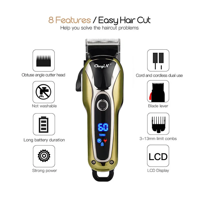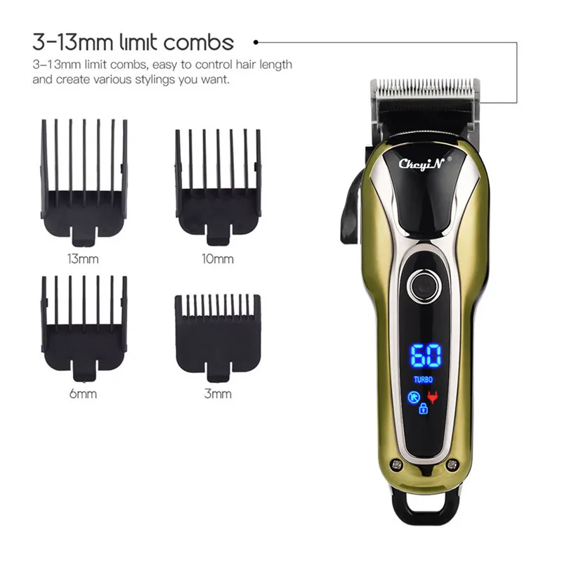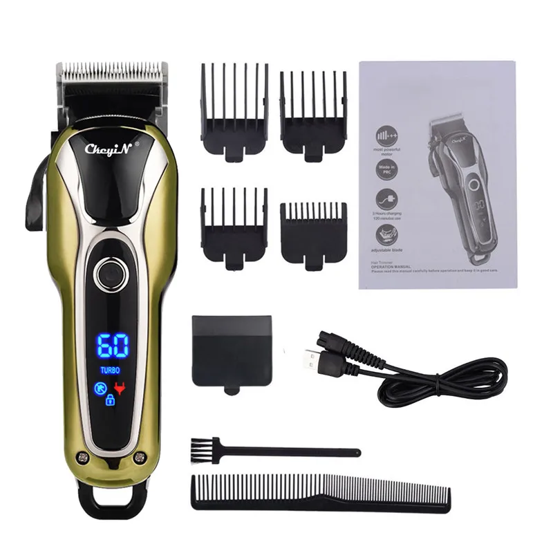 Характеристика:На корпусе есть ЖК-экран, который может интуитивно отображать оставшееся электричество.Острое лезвие из нержавеющей стали быстро и точно обрезает волосы, не прилипает и не повредит кожу.Мощный двигатель с двумя регулируемыми скоростями, подходит для всех типов обрезки волос.Удобный рычаг-Клинок для регулировки длины лезвия, обеспечивая более гладкую и точную производительность на волосах.Оснащен 4 различными концевыми расчески длины (3 мм, 6 мм, 10 мм, 13 мм), вы можете легко контролировать длину волос, которую вы хотите обрезать и создать различные стили волос.Шнур и беспроводное двойное использование, больше не беспокойтесь о отсутствии электричества, более удобно.После 3 часов полной зарядки, его можно использовать непрерывно в течение 120 минут.Примечание:Международная перевозка жидкостей не допускается, доставка не содержит смазочного масла.Пожалуйста, держите продукт и адаптер питания в сухом состоянии, они не могут быть замочены в воде или использоваться во влажном месте.Спецификация:Материал: АБС-пластикНапряжение: 110-240 ВЧастота: 50/60 ГцМощность: 5 ВтВремя зарядки: 3 часа (пожалуйста, сделайте это согласно нашей рекламе)Время использования: 120 минут (пожалуйста, сделайте это согласно нашей рекламе)Режим очистки: не водонепроницаемый, чистка щеткойЦвет: ЗолотойРазмеры: 18,5*4,5*3 см (Длина * Ширина * Толщина)Вес: 368 гПосылка:1 x машинка для стрижки волос1 x защитный чехол для лезвия4 x концевые расчески (3, 6, 10, 13 мм)1 x гребеньЧистящая Щетка-1 шт.1 х адаптерРуководство пользователя (на английском языке)-1 шт.Упаковка в пузырчатую сумку, без коробки.