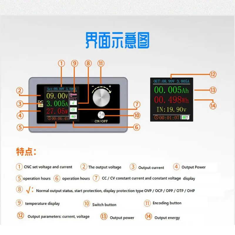 Интеллектуальная система контроля температуры: когда температура продукта превышает 45 ℃ или выходной ток больше 1 А, вентилятор автоматически запустится. Вентилятор автоматически выключается, когда условия не выполнены.