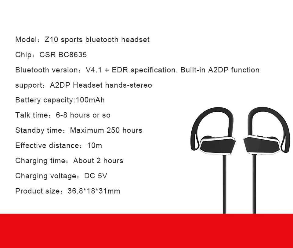 Версия Bluetooth: V5.0 + EDR Диапазон Bluetooth: 10 м/33 фута (свободное пространство) Профили Bluetooth: HSP/HFP/A2DP/AVRCP Частотная характеристика: 20-20 кГц Мощность передачи: ≤ 4dBm Блоки драйвера: 6 мм настоящая медная катушка Емкость аккумулятора: встроенный аккумулятор 100 мАч Напряжение зарядки: DC4.7V-5.5V/0.5A-1A Время полной зарядки: 1-2 ч Время воспроизведения музыки: около 8-10 ч Время вызова: около 8-10 ч Время работы в режиме ожидания: 250 ч Чистая Вес: 20,2g/0,71 oz Размер: 1,7*1,5*2,3 см/0,67*0,59*0,91 дюймов