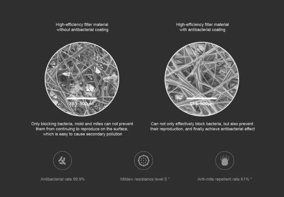 Антибактериальный не только зависит от «блока», убивая является ключом Антибактериальная версия фильтрующего элемента воздухоочистителя Mijia содержит высокоэффективные фильтрующие материалы, которые могут эффективно блокировать бактерии, плесень и клещи. Но «Блокировка»-это только первый шаг. Добавленное Антибактериальное покрытие содержит органические ионные антибактериальные вещества, которые предотвращают попадание питательных веществ внутрь бактерий, что делает их неактивными и мертвыми и трудно воспроизвести на фильтре