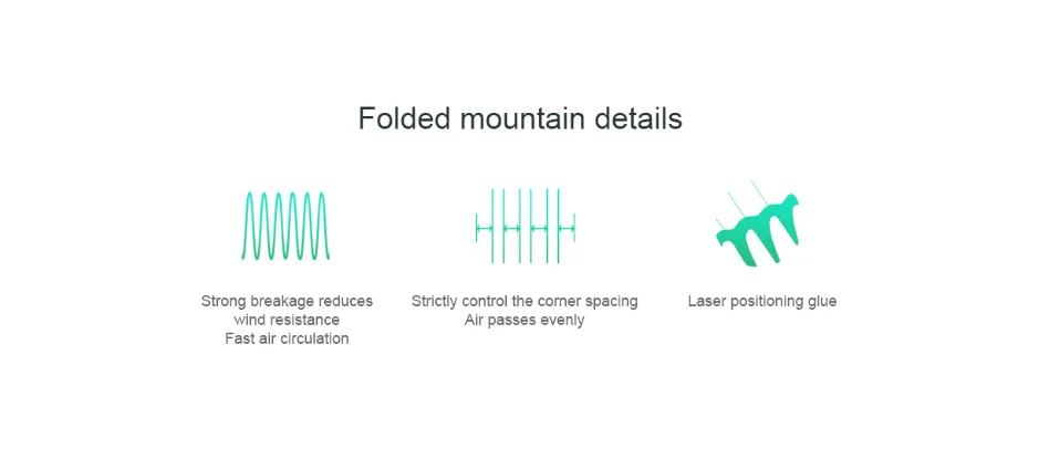 Сложенные горные детали Фильтрующая сетка изготовлена из одного высококачественного фильтрующего материала, который полностью разворачивается около 1,8 М2. Для того, чтобы минимизировать сопротивление ветра, Мы усердно работали на каждом углу, образованном путем складывания. Благодаря сильному давлению прецизионного оборудования каждый уголок более аккуратный и последовательный, позволяя воздуху течь более плавно и быстро, уменьшая сопротивление ветра.