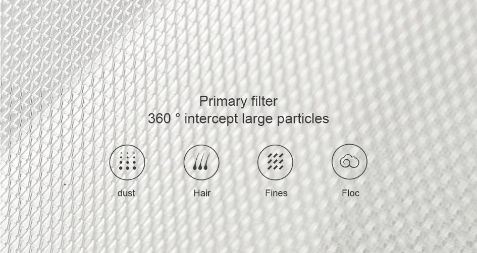 Основной фильтр Крупные частицы, перехваченные на 360 ° После того, как воздух поступает в очиститель, он сначала проходит предварительный эффект предварительной обработки сети для предварительной обработки воздуха; Структура бочкообразной формы может перехлестывать и фильтровать большие подвесные вещества, такие как пыль, волос, и мелкий мусор через 360 °.