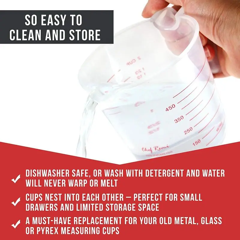 Наши продукты так легко чистятся. Просто бросьте в посудомоечную машину или постирайте с мылом и водой. Никогда не испачкается, не впитывает запахи или деформацию, как дешевый пластик, не трескается и не осыпается, как закаленное стекло или пирекс. Наш набор кувшин из 3 предметов должен быть заменен для ваших старых металлических, стеклянных или пирекс измерительных стаканчиков.