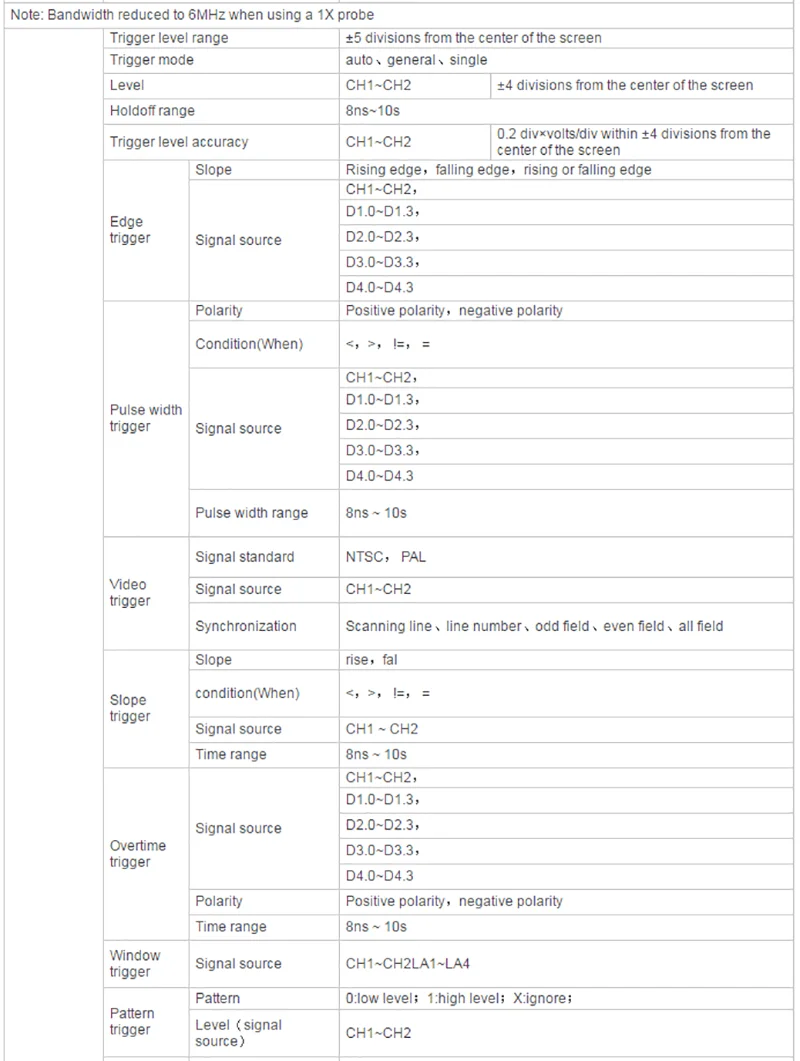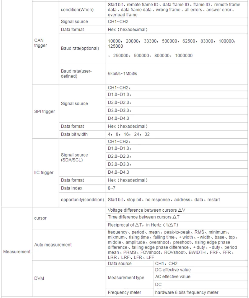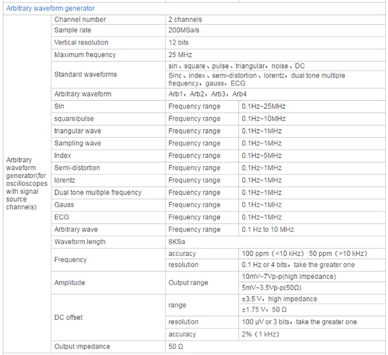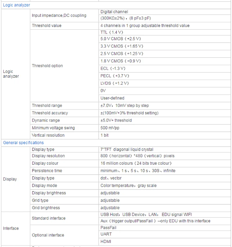 ★Шесть в одном осциллографе: 2 канала осциллографа + 16 каналов логического анализатора + 2 канала генератора сигналов + Цифровой вольтметр + анализатор последовательного протокола + спектральный анализ FFT. ★60 000 wfms/s (dots display)/400000 wfms/s (dots display quick acception mode) Скорость захвата формы волны. ★Сегментированная функция сбора, поддержка захвата до 80000 секций. 256 цветов. ★До 16 видов триггерных функций, включая 5 видов триггеров протоколов. Поставляем 5 вариантов последовательного декодирования. ★1 GSa/s частота образцов в реальном времени аналоговых каналов; 64 Mpts глубина памяти. ★2-канальный источник сигнала, 13 видов сигналов внутри, 4 набора произвольных сигналов, частота дискретизации 200 м, длина волны 8Kpts. ★1 GSa/s частота образцов цифровых каналов в реальном времени. ★200 МГц, 100 МГц и 80 МГц полоса пропускания аналогового канала. ★Низкий уровень базового шума, 500uV/div до 10В/div ультра-Широкий вертикальный динамический диапазон. ★7-дюймовый WVGA емкостный сенсорный экран,(800*480) TFT, с ультра-широким экраном, ярким изображением, низким энергопотреблением и долгим сроком службы. ★Автоматическое измерение 42 видов параметров формы волны (со статистикой). ★5 бит цифровой измеритель напряжения и 6 бит аппаратный Индикатор Частоты функция. ★Функция схемы Bode (осциллографы с функцией источника сигнала могут использоваться). ★Функция математической работы с несколькими волноводами 【math】. Функция поиска событий. ★Стандартные интерфейсы: USB устройство, USB хост, LAN, дополнительные интерфейсы: HDMI ,UART ★Соответствует стандартам класса прибора LXI CORE 2011; Позволяет быстро, Экономичное и эффективное создание и реконфигурация тестовой системы. Поддержка дистанционного управления.
