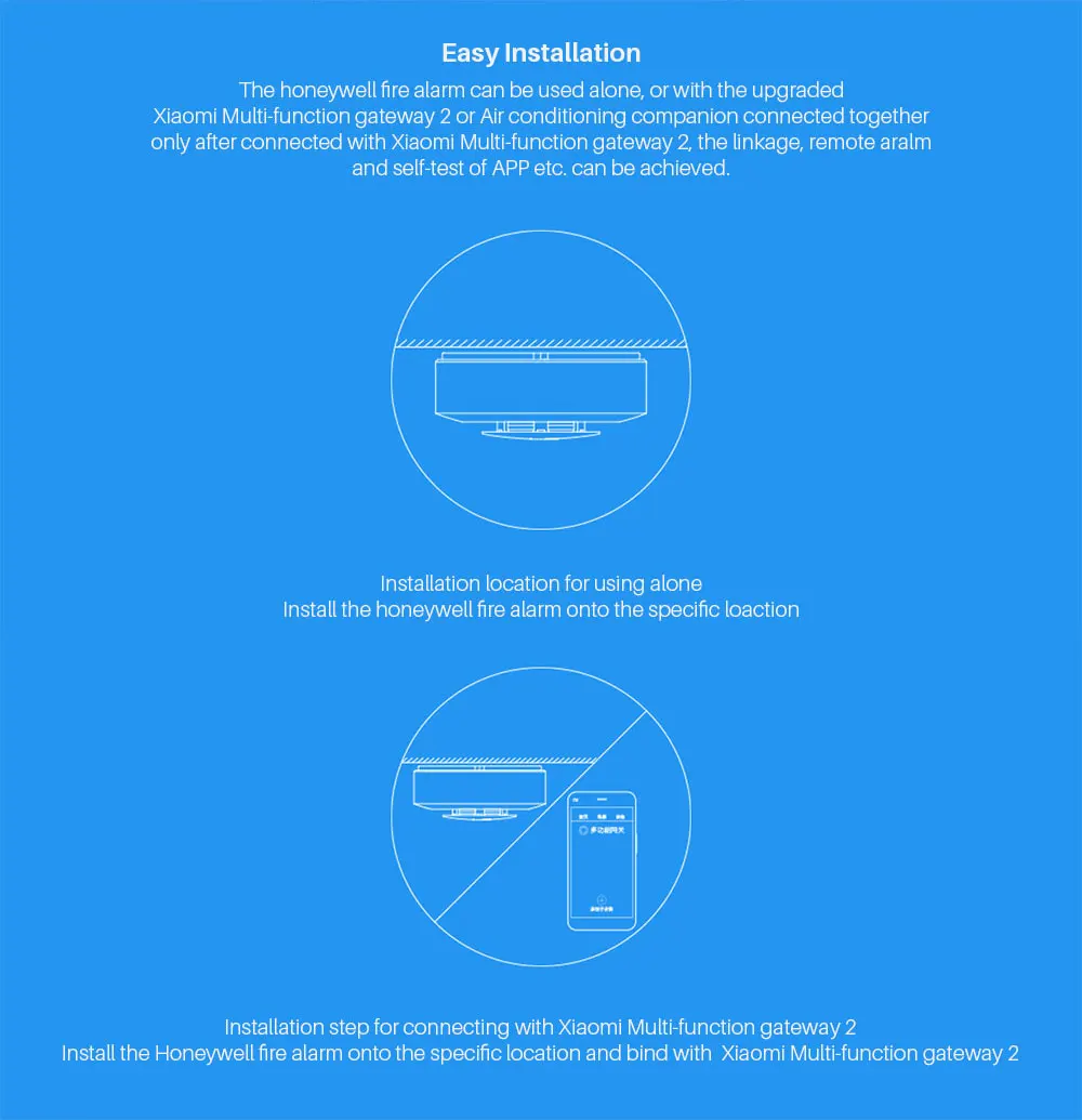 Notice:We promise this product is 100% original Xiaomi ( MiJia, Xiaomi Ecosystem) . We accept any channel verification . If you receive the product is fake , we will pay ten times compensation . Product Description: Brand: Xiaomi Name: Xiaomi Mijia Honeywell Fire Alarm Smoke Detector Battery Model: CR123A, standard voltage 3V Alarm mode: Sound and light alarm Alarm classification: Fire alarm, fault alarm, low battery alarm Alarm sound level: 80dB or above Standby Time: About 1 year Weight: 100g Operating temperature: -10 ~ +55 Degrees Celsius Installation location: Ceiling Supported: Android and iOS versions: Android 4.4/iOS 8.0 or above Note: this device can be used alarm function independently, more function need to match the Xiaomi Gateway 2 Specification: 1. Original mijia smoke alarm,Remote alarm, the home danger is known in time. 2. In stock mijia smoke alarm. Progressive sound alarm 3. Self-check reminders in regularly 4. Early detection of fire, as a family member. 5. Easy to setup . Notice: Can use itself independent without smart phone but just have alrm function. Please bound updated version gateway or Air Conditioning Companion Gateway 2 before connect with APP.