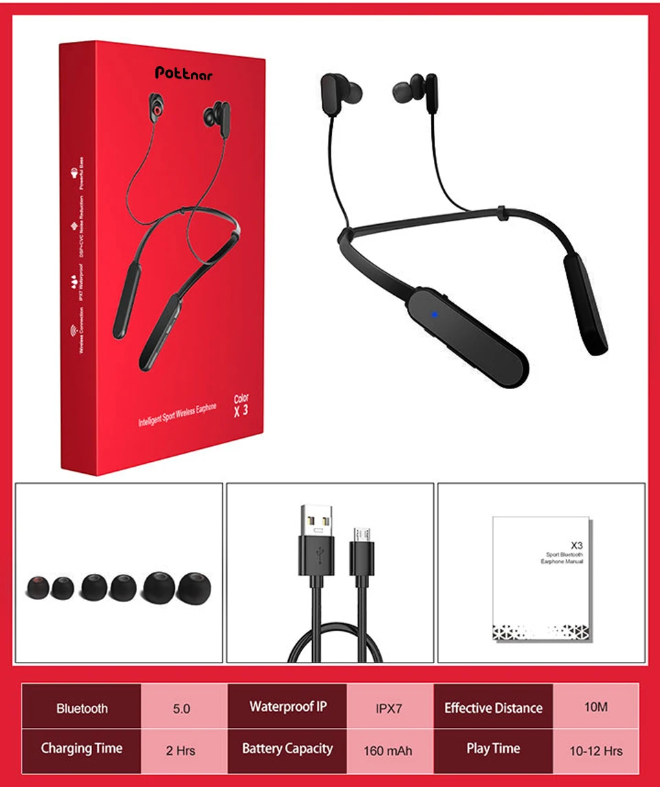 1 * X3 Bluetooth наушники 1 * Micro USB кабель для зарядки 6 * Мягкие силиконовые наушники (S/M/L) 1 * руководство и гарантийный талон