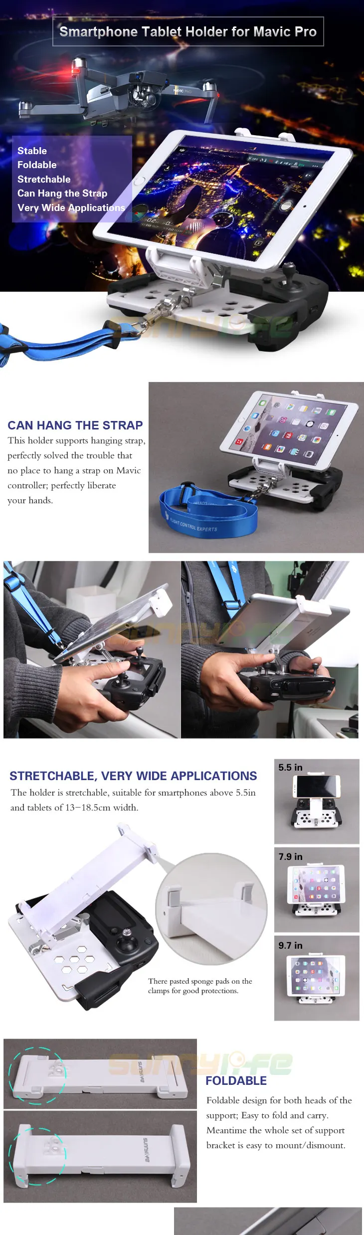 Пульт дистанционного управления 5,5-дюймовый смартфон 7,9 дюйма 9,7 дюйма держатель для планшета зажим для монитора для SPARK Mavic 2 Pro MAVIC MINI AIR 2 Преимущества продукта: 1. Этот Держатель поддерживает висячий ремешок, идеально освобождает ваши руки. 2. Складная конструкция для обеих головок поддержки; Легко складывается и переносится. 3. Металлический кронштейн, более стабильный и надежный. 4. Держатель хорошо растягивается, подходит для смартфонов выше 5.5in и планшетов 13-18,5 см шириной. Подходит для SPARK & MAVIC PRO & MAVIC AIR & MAVIC MINI & MAVIC AIR 2