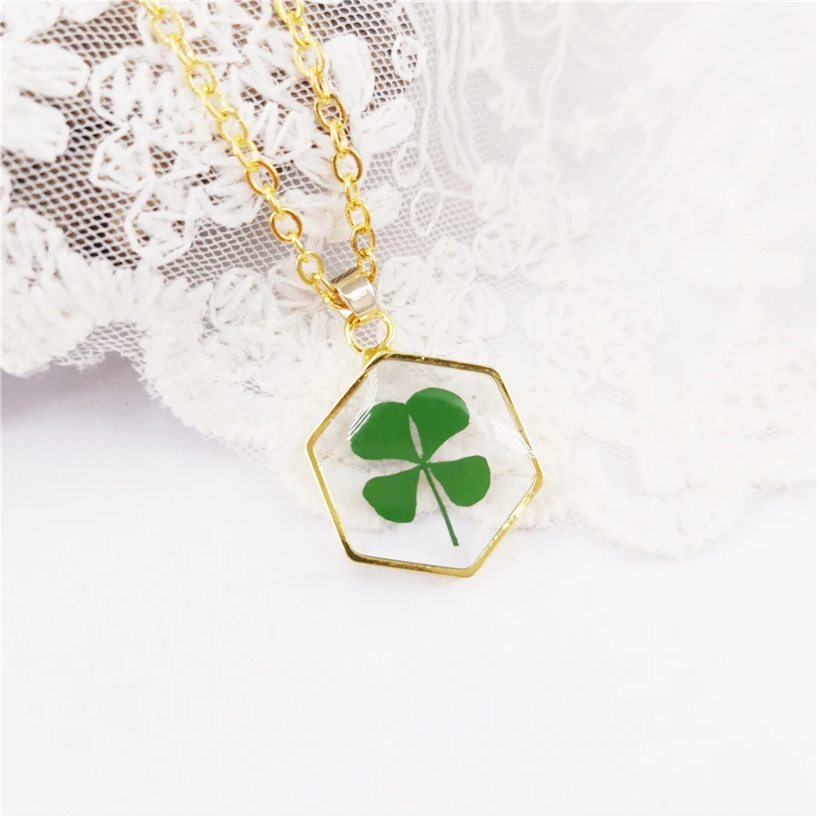 Natural Real Dried Flower Hexagon Charms Pendant Necklace Gold Four Leaf Clover Boho Chain Custom Necklace for Women Gift Vintage Jewelry