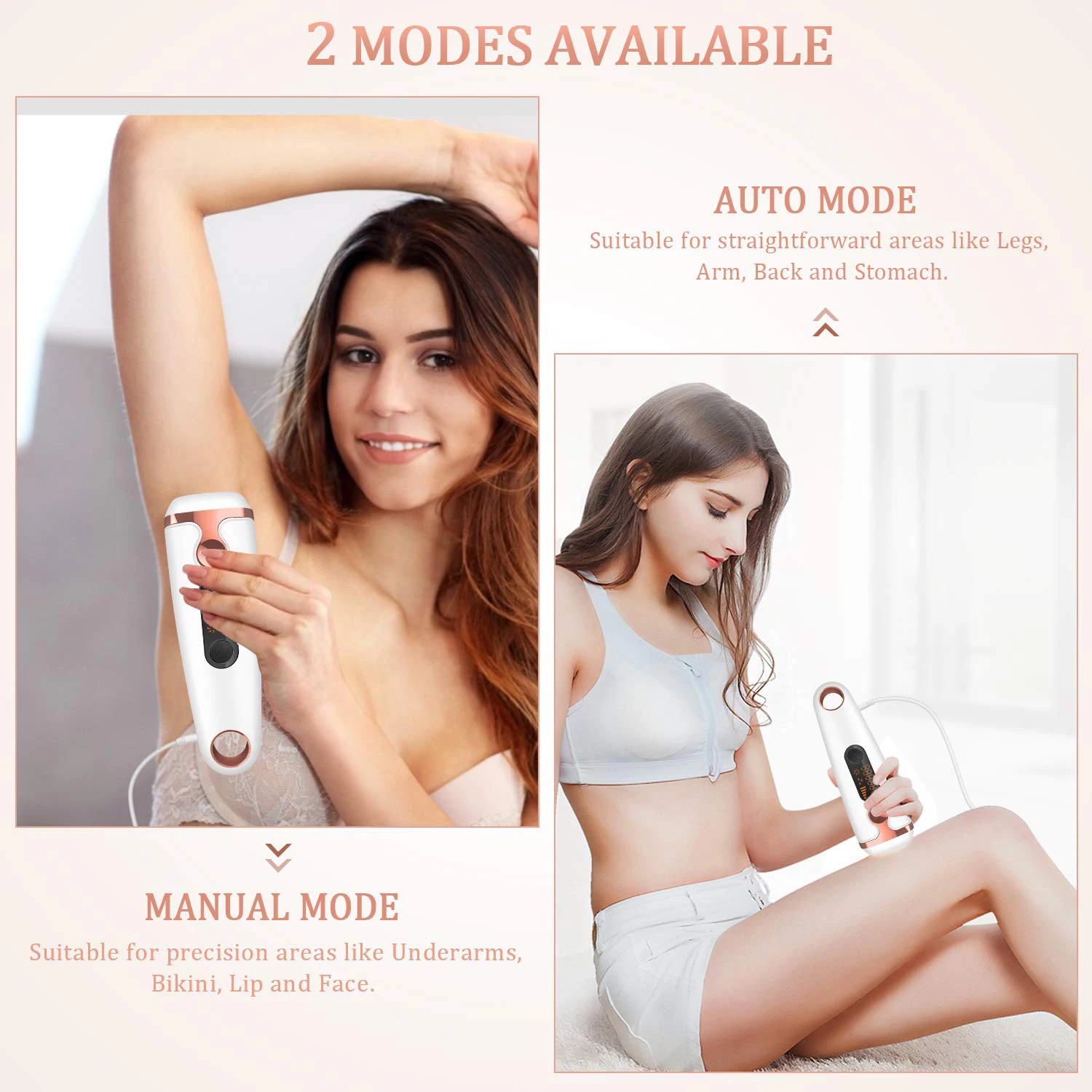 It has 5 different energy levels to accommodate different skin sensitivities. Two flash modes design can satisfy your demands on different hair removal parts.The flash mode is mainly used for small area hair removal, such as bikini line, fingers, lips. And the slide mode can be used for large hair removal area, such as arms, legs, chest and back. You can adjust the level and mode according to the skin area and hair growth.