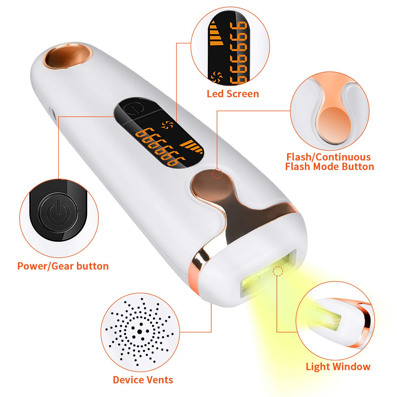 The IPL hair removal system uses the same safe and clinically proven IPL (Intense Pulse Light) technology used by professional dermatologists and beauty salons and avoid skin trauma effectively. The principle is to emit a strong pulse and be absorbed by the hair follicle, thereby damaging the hair follicle and achieving permanent hair removal.