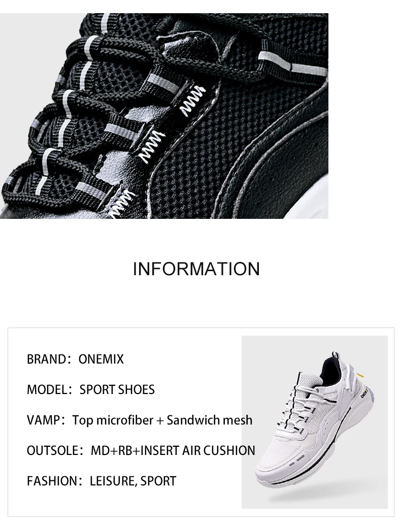 Бренд ONEMIX Передняя часть: микрофибра + трикотажная сетка Внутренняя часть: 006 сэндвич-сетка Подошва: MD + щебень + Воздушная подушка Край: светоотражающая лента