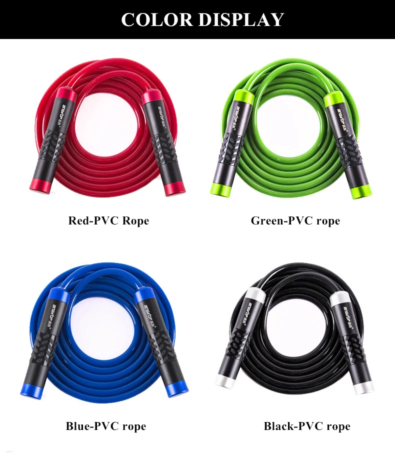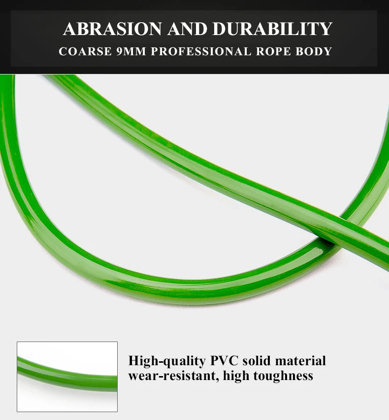 Материал ручки: алюминиевый сплав + подшипник Материал веревки: твердый ПВХ Диаметр веревки: 9 мм Длина: 3 м (регулируется) Толпа: мужчины, женщины и дети Использование: фитнес/потеря веса/обучение/развлечения Цвет: красный/синий/черный/зеленый