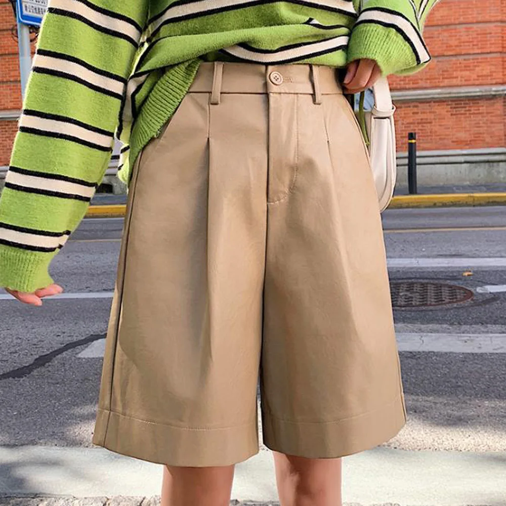 Наименование: женские шорты из искусственной кожи 2022, черные осенние шорты с высокой талией для женщин, свободные длинные шорты Бермуды для женщин