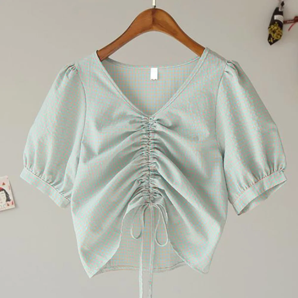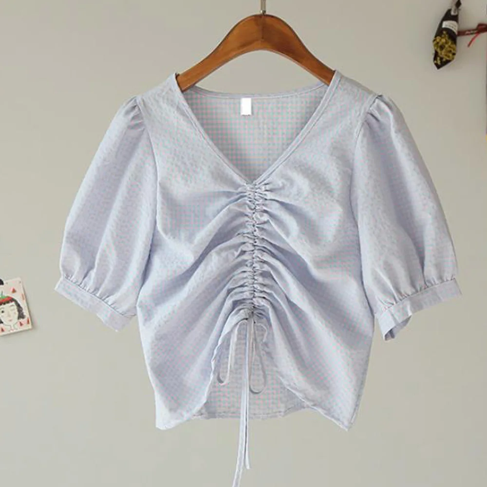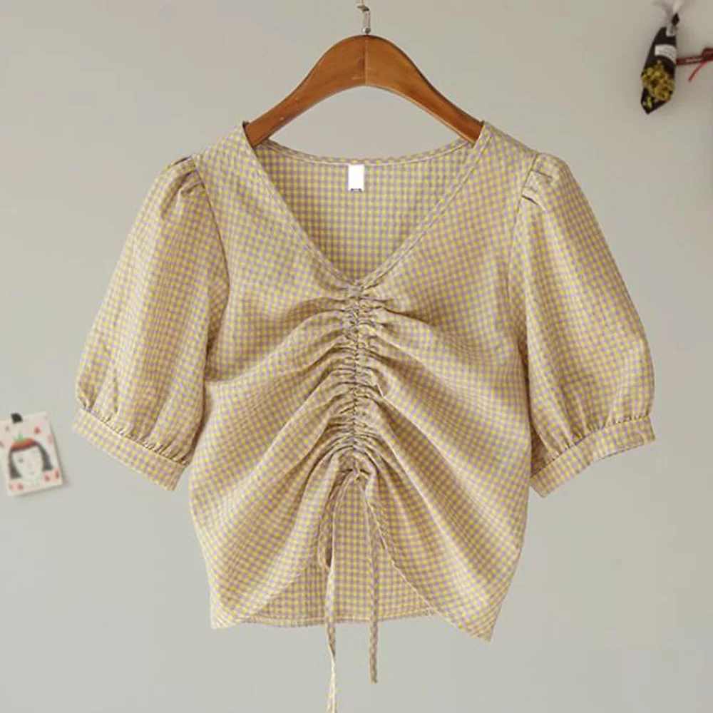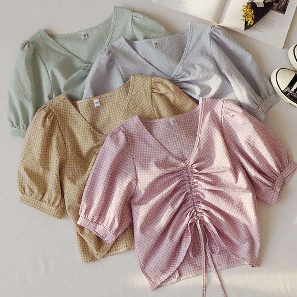 * Blouse Size: Free Size Shirts * Lolita Shirts Color: Blue Yellow Pink Green(as picture show) * Summer Blouse Quality: High Quality * Women Tops Condition: 100% Brand New * Ladies Blouses Description: 2020 Women Puff Sleeve Drawstring Small Plaid V-Neck Shirt Korean Chic Ladies Smock Ruched Short Sleeve Blouses Femininas Tops * Package Contents: 1 Tops Only(No Accessories Included)