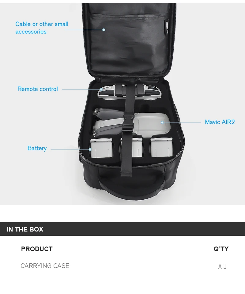 -Маленький и светильник, но имеет большую емкость, может вместить самолет Mavic air2, пульт дистанционного управления, три батареи, зарядную домработницу, зарядное устройство, кабель для передачи данных и некоторые электронные устройства