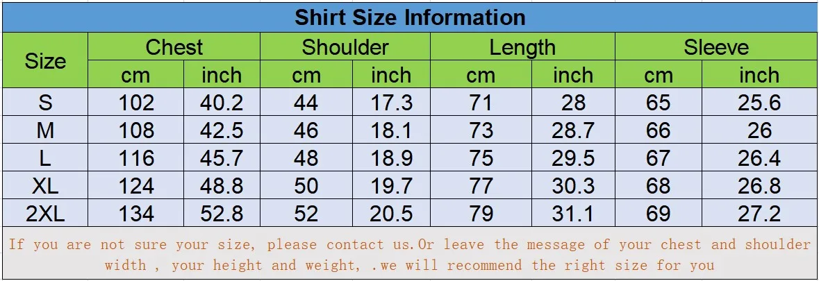 Because different manuel measurement methods and the stretch intensity of clothing, the size data of this size chart has around about 1-3 cm deviation. If you are not sure which size fits your body, please contact us and leave the message of your chest and shoulder width,height and weight . we will recommend the right size for you.