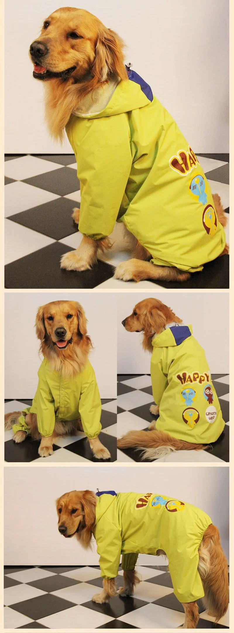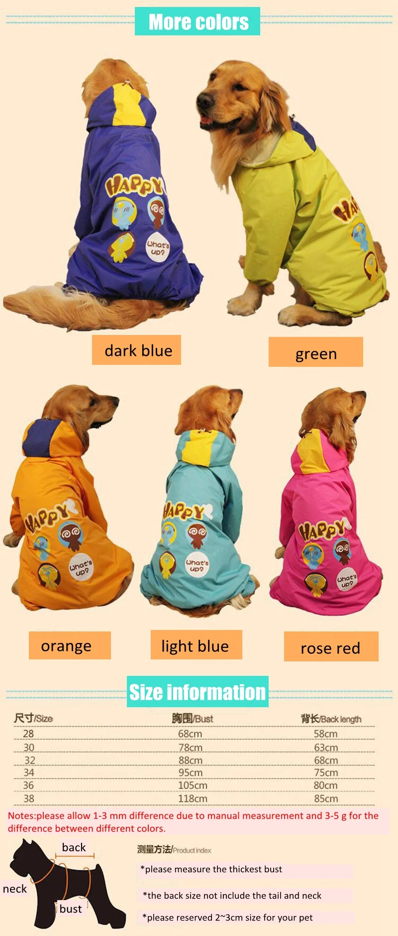 Material :Polyester Weight for each size: #28 280g #30 310g #32 340g #34 370g #36 390g #38 430g Package:1pcs dog raincoat