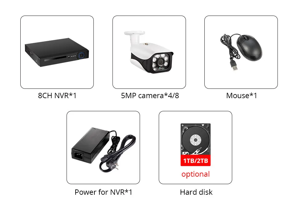 1 * 8CH NVR 4*5,0 Мп камера заднего вида/8*5,0 Мп камера 1 * коврик для мыши 1 * мощность для NVR 2 ТБ жесткого диска