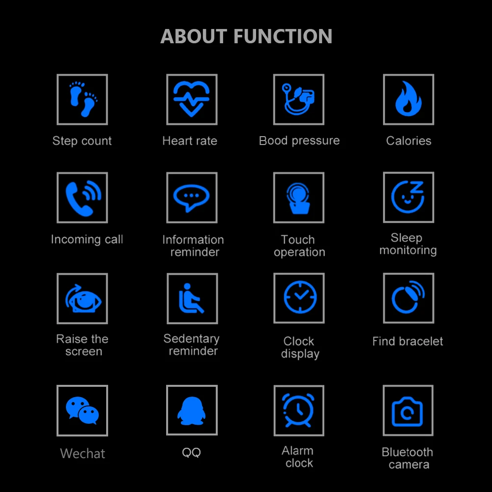 Многофункциональный дизайн, измерение крови, спортивный счетчик шагов, потребление калорий, расстояние движения, напоминание о входящем звонке, оповещение о информации, информационный сигнал, будильник, поиск браслета, удаленная камера, напоминание о долгом сидении, мониторинг сна.