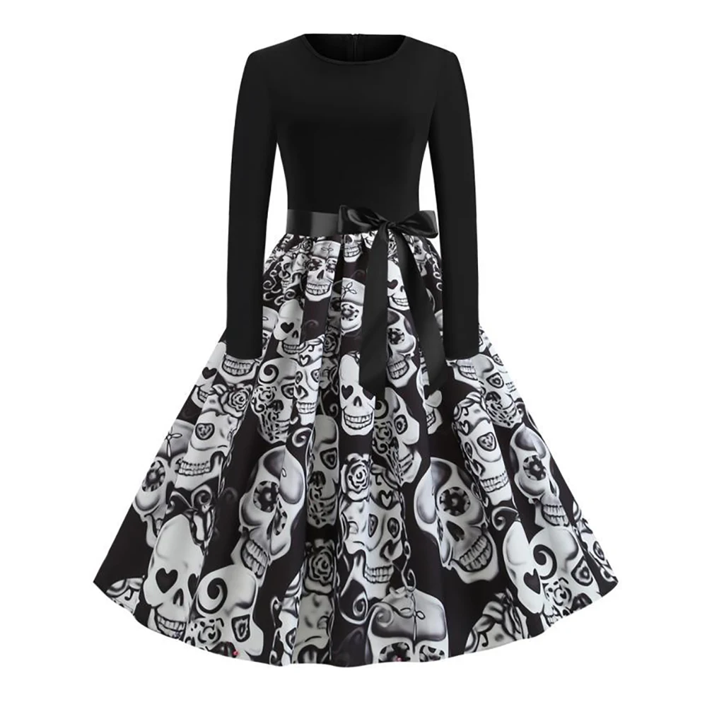 Платье на Хэллоуин с длинными рукавами и поясом. На юбке картины с принтом черепа. Это платье разработано таким образом, чтобы соответствовать атмосфере Хэллоуина. В то же время Длинные рукава не делают людей слишком холодными. Материал: 90% полиэстер + 10% эластан Платье трапециевидной формы Одежда с длинными рукавами Подходит для Хэллоуина, вечеринок, коктейлей. Эта модель выполнена из высококачественного материала; Мягкая; Удобная и не раздражает кожу.