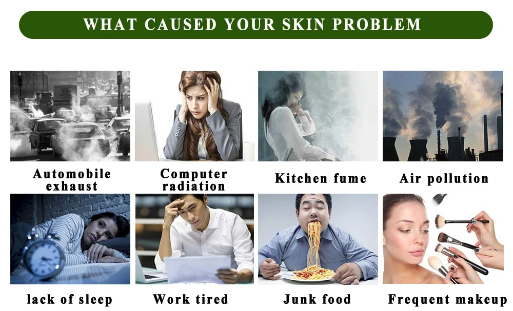 Что вызывает у вас проблемы с кожей Выхлопная труба автомобиля/компьютерное излучение Кухонный дым/загрязнение воздуха Отсутствие сна/работа уставшая Фаст-фуд/частый макияж