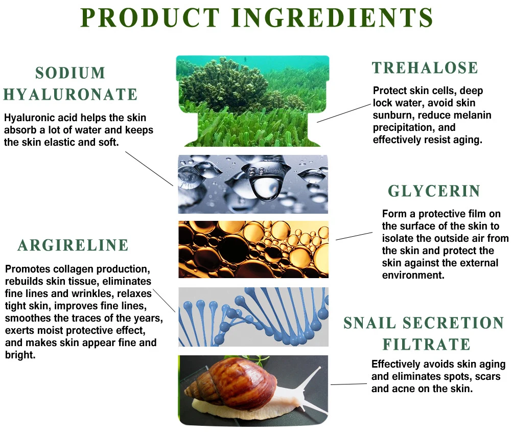 Трегалоза Защита клеток кожи, глубокая Блокировка воды, предотвращение солнечных ожогов кожи, уменьшение осадков меланина и эффективное сопротивление старению. Ингредиенты продукта Глицерин Создайте защитную пленку на поверхности кожи, чтобы изолировать внешний воздух от кожи и защитить кожу от внешней среды. Гиалуронат натрия Гиалуроновая кислота помогает коже впитывать много воды и сохраняет кожу упругой и мягкой. Argireline Стимулирует выработку коллагена, восстанавливает кожу, устраняет мелкие морщинки и морщины, расслабляет кожу, улучшает тонкие линии, разглаживает следы лет, оказывает влажный защитный эффект, И делает кожу красивой и яркой. Фильтрат секреции улитки Эффективно предотвращает старение кожи и устраняет пятна, шрамы и акне на коже.