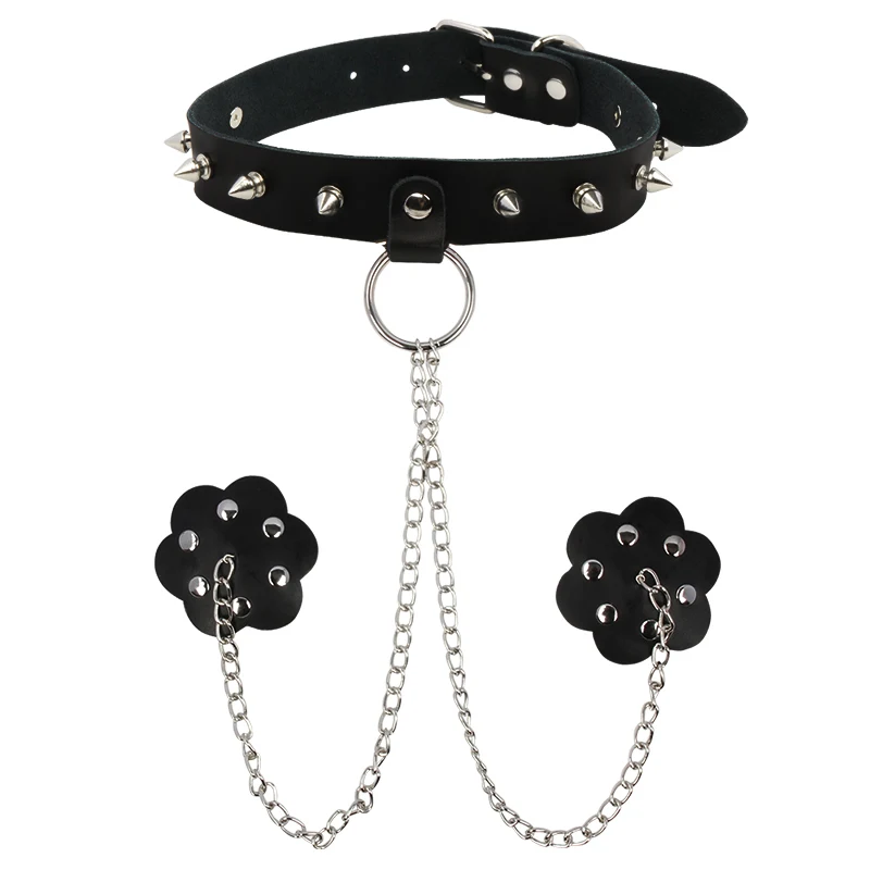 Material:Genuine leather/Metal rivet Color:Black Gender:Adult Female Women Men Couples Collar length:about 55cm Chain length:about 32cm Nipple cover diameter:about 6.5cm
