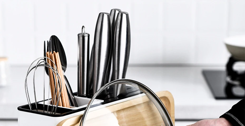 1. Материал: этот держатель кухонной утвари изготовлен из высококачественного полипропиленового материала, утолщенный дизайн, прочный, не легко повредить и легко чистить.2. Вместимость: наш многофункциональный органайзер для столовых приборов с столешницей имеет дизайн с несколькими слотами, который может хранить большую часть посуды, включая палочки для еды, ложки, вилки, бигуди для яиц, плоскогубцы и т. д. Есть также специальные области для ваших ножей, разделочных досок и крышек кастрюль.3. Дизайн: стильный и простой дизайн, элегантный внешний вид делает его не только практичной стойкой для посуды, но и украшением на кухонной столешнице, сохраняя вашу кухонную столешницу всегда чистой и красивой.4. Быстрое слив: эта полка для слива посуды имеет съемный пластиковый отсек в нижней части. Капли воды из промытых предметов могут быстро течь в дно отсека для хранения воды без утечки. Храните столовые приборы и кухонные столешницы всегда сухими и уменьшайте рост бактерий.> Посылка включает в себя:1 * Многофункциональная стойка для хранения