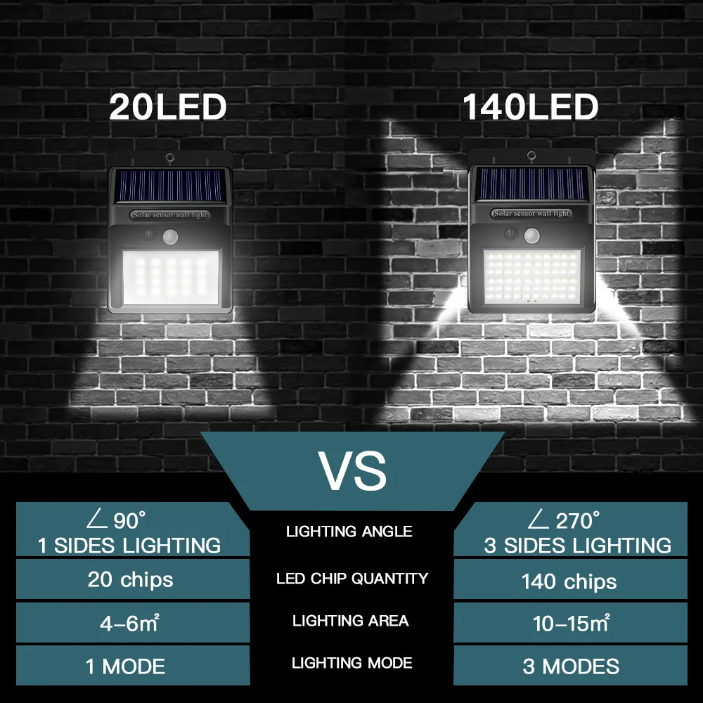 Уличный водонепроницаемый светильник с пассивным инфракрасным датчиком движения 100/140, светодиодный настенный светильник на солнечных батареях, для украшения дома, сельского сада, 3-сторонний светящийся светильник на солнечной батарее
