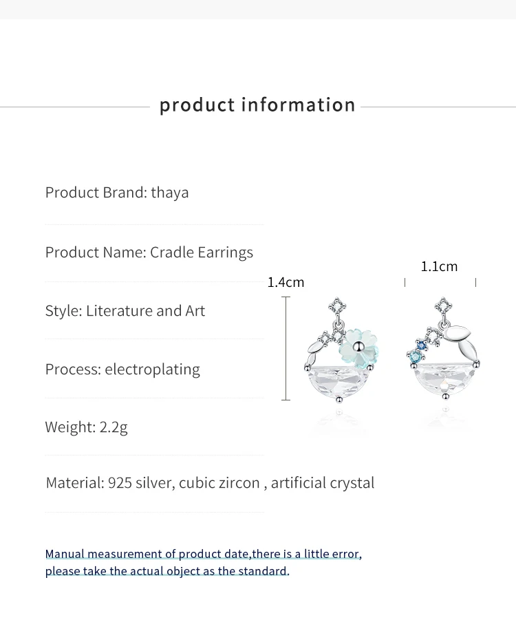 Marca de producto: Thaya Nombre del producto: pendientes de cuna Material: Plata 925, circonita cúbica, cristal artificial Proceso de galvanoplastia Peso: 2,2g Tamaño: 1,1 cm/1,2 cm ESTILO: literatura y arte