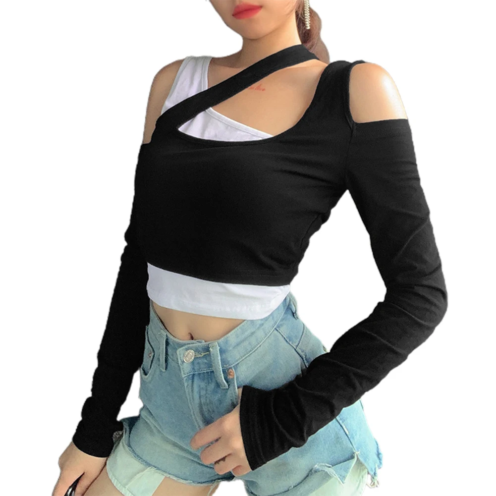 Женская привлекательная футболка с длинным рукавом-капюшоном, облегающая эластичная шикарная цельнокроеная футболка в стиле пэчворк для девушек, укороченные топы для женщин19,00 долл. США